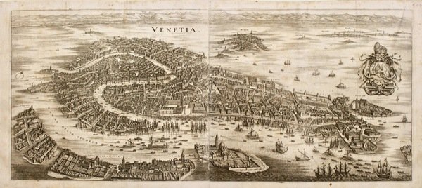 Incisione in rame, mm 305x710. Bella veduta prospettica generale della città di Venezia arricchita da cartiglio con corona dogale e leone alato oltre che numerose navi e barche oltre che dal Bucintoro nel canale della Giudecca. Comprende l'intera cittò, Murano, la Giudecca e l'isola di S. Giorgio. Tratta da "Theatrum Europaeum…", "Archontologia Cosmica" e "Topographia Italiae" del 1688. Esemplare del secondo stato con le consuete tracce di usura del rame. Ottimo esemplare con ampi margini. Pieghe editoriali.<BR>Matthäus Merian, detto il vecchio (1593-1650), è stato un incisore e disegnatore svizzero naturalizzato tedesco. Moretto, "Venetia, le immagini della Repubblica", 69<BR>Copper engraving, mm 305x710. Famous bird-eye view enriched by an elegant cartouche with lion and many ships and boats including the Bucintoro in the Giudecca channel. The print appears in 3 different works "Theatrum Europaeum…", "Archontologia Cosmica" and "Topographia Italiae" (in 1688). Second state with the usual traces of worn plate but very good condition. Publisher's folds. Moretto, "Venetia, le immagini della Repubblica", 69 <BR>