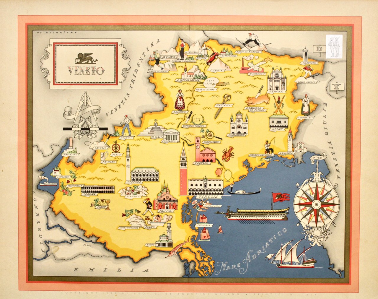 Cromolitografia, mm 380x480, firmata "Vs Niculine". Tratta da "Imago Italiae" pubblicato da De Agostini<BR>Curiosa ed assai decorativa carta della regione che mette in mostra i principali monumenti. L'autore Vsevolode Petrovi? Nicouline nacque nel 1890; fu costretto all'esilio dopo la vittoria di Lenin; si trasferì in Italia dove si sposò, visse e morì lavorando come noto illustratore per pubblicità, riviste ed altro. Ottimo esemplare. <BR>
