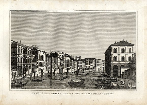 VENEZIA - "Ansicht des Grosen Canals vom Pallast della Ca' d'Oro", bello scorcio del Canal Grande animato da gondole, barche e case ai fianchi.