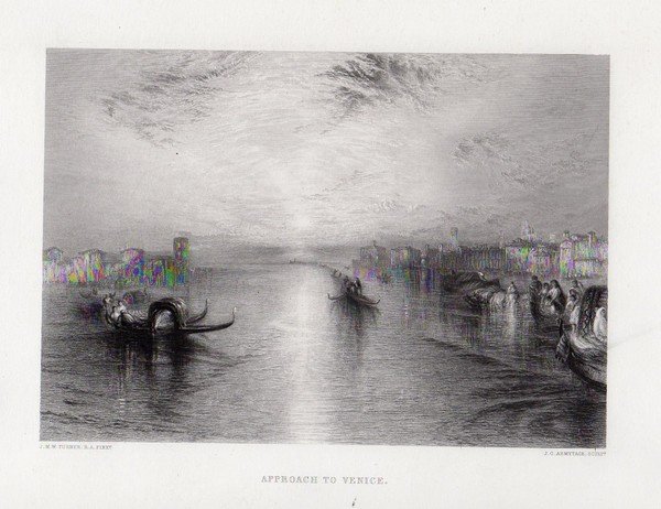 VENEZIA – “Approach to Venice” splendida e ampia veduta della città avvolta nella bruma. Numerose gondole.