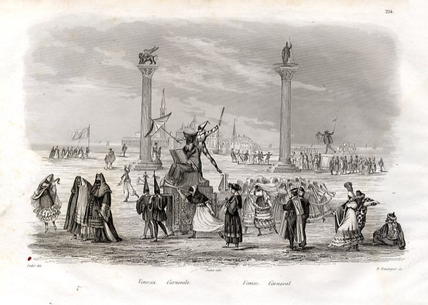 VENEZIA - "Carnevale". Maschere in processione e veduta sullo sfondo della città.