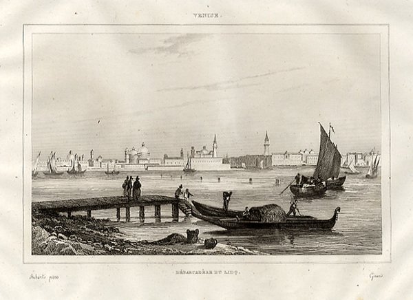 VENEZIA - "Débarcadère du Lido" suggestiva veduta della città presa dal lido, con barce e gondole e imbarcadero in primo piano.