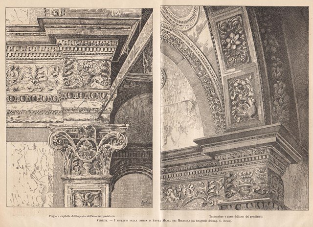 Rappresentazione di due particolari interni: Fregio e capitello dell’imposta dell’arco del presbiterio - Trabeazione e parte dell’arco del presbiterio. Testo al retro