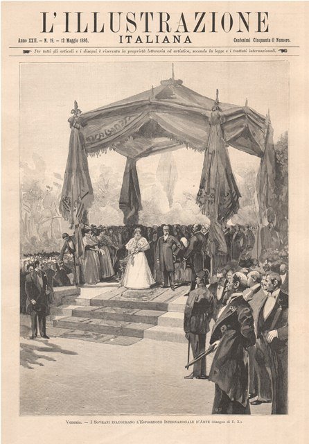 Veduta del re Umberto I (Torino 1844 - Monza 1900) e della regina Margherita di Savoia (Torino 1851 - Bordighera 1926) all’inaugurazione dell’Esposizione Internazionale d’Arte a Venezia. Testo al retro