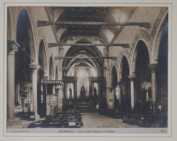 Fotografia originale di mm 195 x 245 , alla gelatina ai sali d'argento su carta baritata. In basso a sinistra "Edizione inalterabile". In mezzo "VENEZIA- Interno della Chiesa di S. Stefano". A destra "3275". Buono stato di conservazione. Queste fotografie con la dicitura "Edizione inalterabile" venivano prodotte dalla "Compagnia Rotografica Società Anonima per Azioni", sede in Milano’, che aveva filiali in molte città italiane.