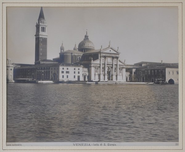 Riproduzione fotografica originale di mm 195 x 245, alla gelatina ai sali d'argento su carta baritata. In basso a sinistra "Edizione inalterabile". In mezzo "VENEZIA- Isola di S. Giorgio". A destra "31". Buono stato di conservazione. Queste fotografie con la dicitura "Edizione inalterabile" venivano prodotte dalla "Compagnia Rotografica Società Anonima per Azioni", sede in Milano’, che aveva filiali in molte città italiane.