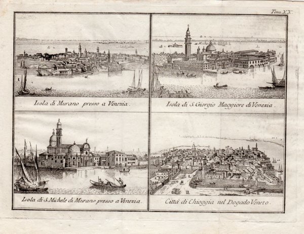 VENEZIA – ISOLE – “Isola di Murano presso Venezia” – “Isola di S. Giorgio Maggiore in Venezia” – “Isola di S. Michele di Murano presso Venezia” – “Città di Chioggia nel Dogado Veneto” Quattro veduta su unica tavola, con dettagliati scorci delle isole veneziane