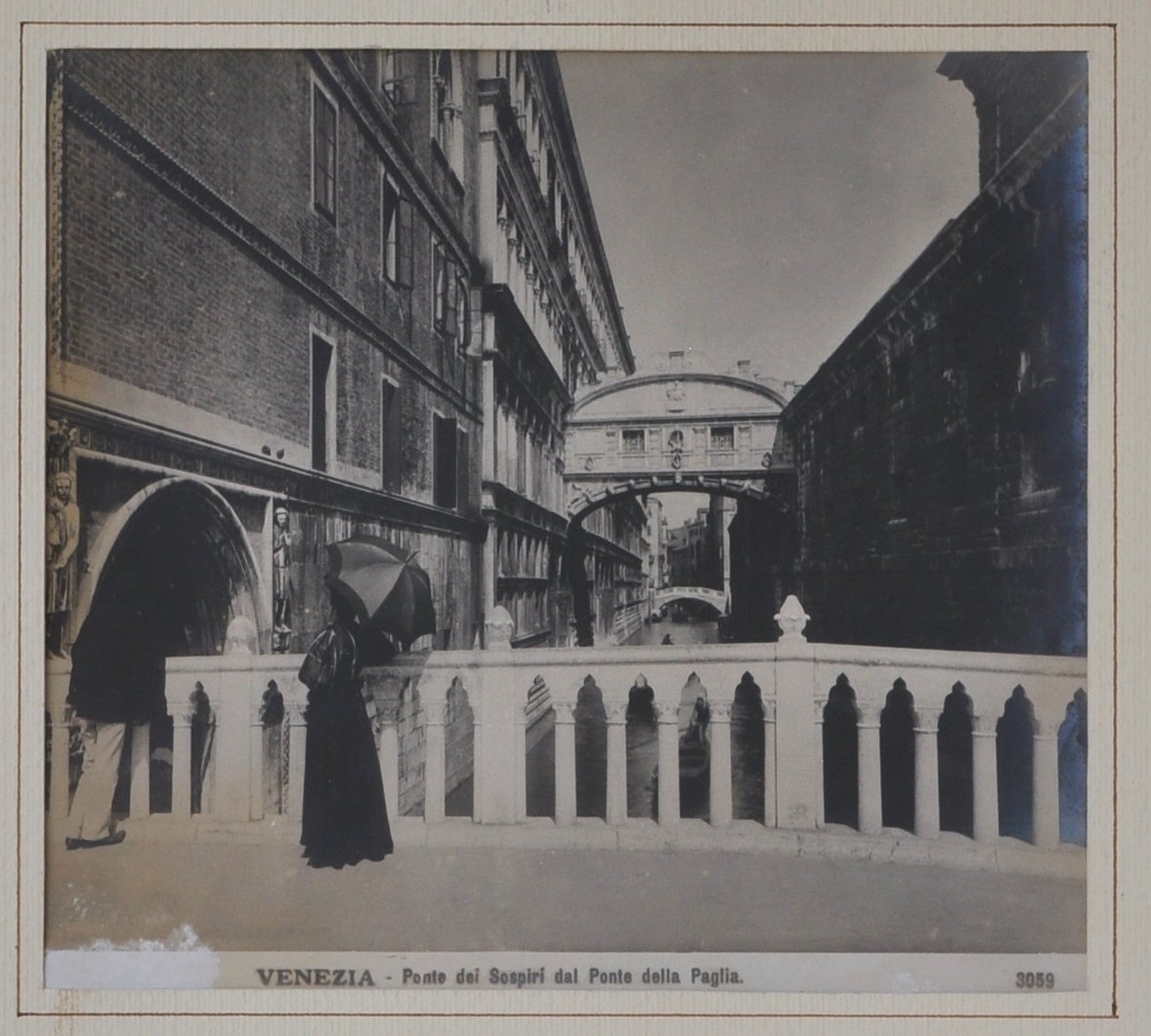 Riproduzione fotografica originale di mm 195 x 245 , alla gelatina ai sali d'argento su carta baritata. In basso a sinistra "Edizione inalterabile". In mezzo "VENEZIA- Ponte dei Sospiri dal Ponte della Paglia". A destra "3059". Buono stato di conservazione. Queste fotografie con la dicitura "Edizione inalterabile" venivano prodotte dalla "Compagnia Rotografica Società Anonima per Azioni", sede in Milano’, che aveva filiali in molte città italiane.
