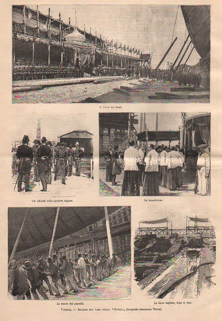 Composizione di cinque vignette: Il palco dei Reali - Gli ufficiali della squadra inglese - La benedizione - Lo stacco dei puntelli - Le bozze tagliate, dopo il varo. Testo al retro