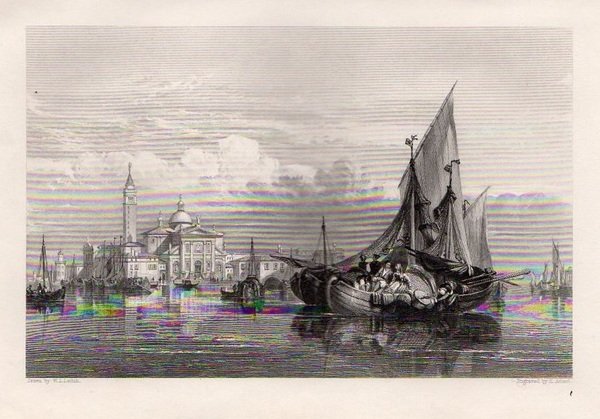 VENEZIA – “Saint-Georges-Majeur, à Venise”. Due belle barche in primo piano e San Giorgio Maggiore sullo sfondo.