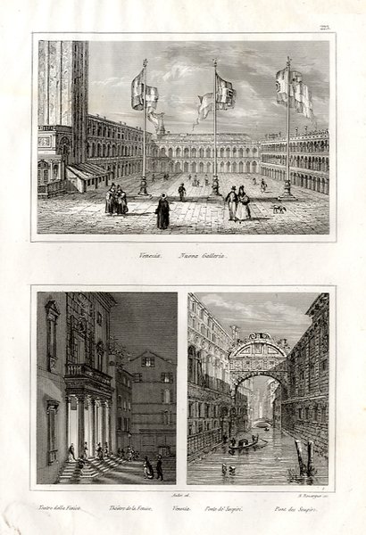 VENEZIA - Tre vedute su unica tavola: "Nuova Galleria" - "Teatro della Fenice" - "Ponte de' Sospiri"
