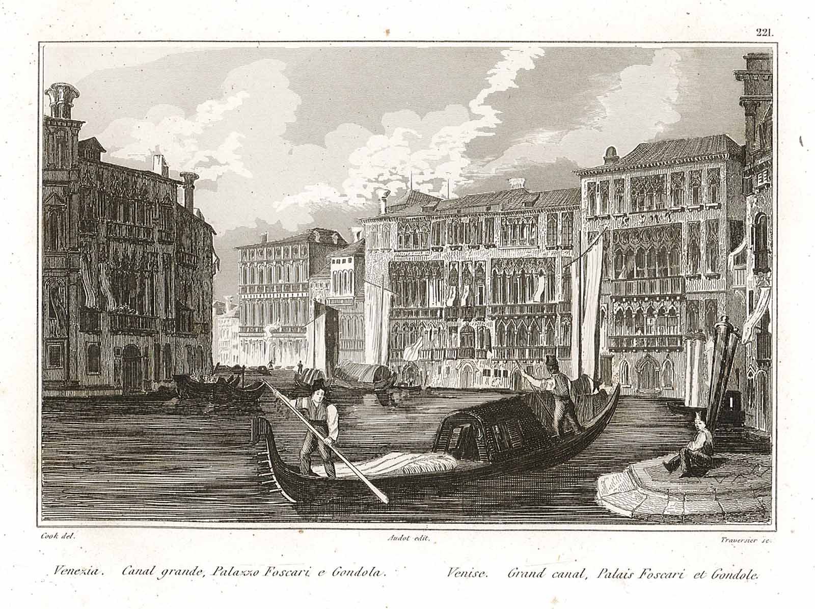 Stampa antica ed originale con veduta del bel palazzo e del Canal Grande, con gondole in primo piano