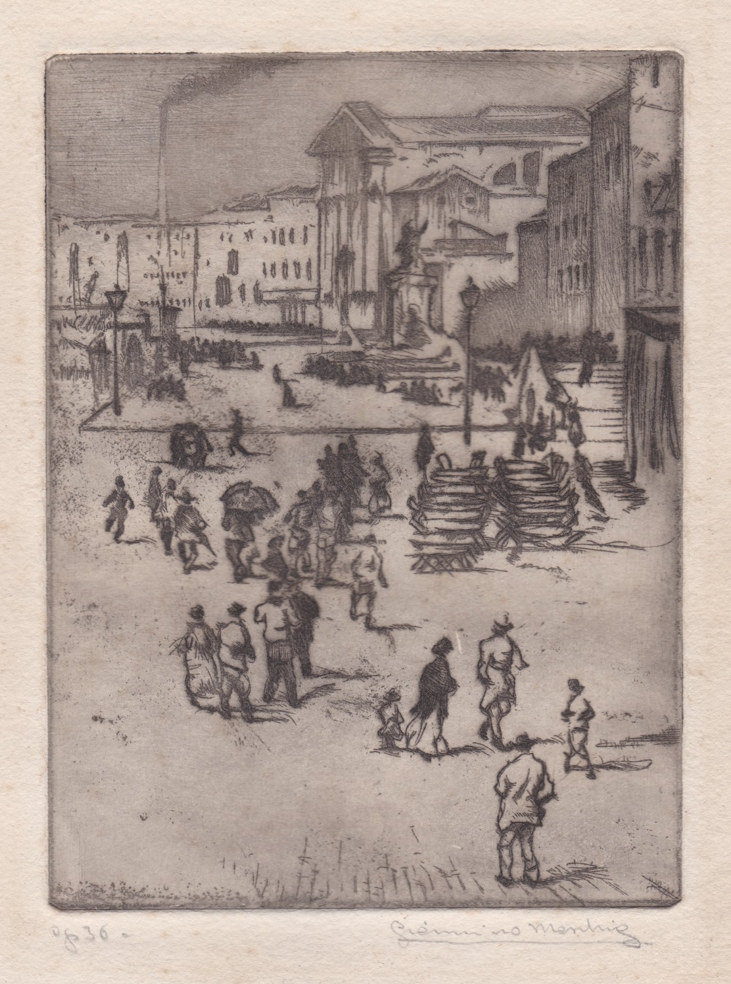 Animata veduta con una ciminiera fumante sullo sfondo, insolito rimando alla contemporaneità. Sotto il soggetto a matita: op. 36 e firma dell'autore. Impressione stampata in inchiostro bruno con velatura su carta forte con frammento di filigrana "Enrico.../P...". Ampi margini.