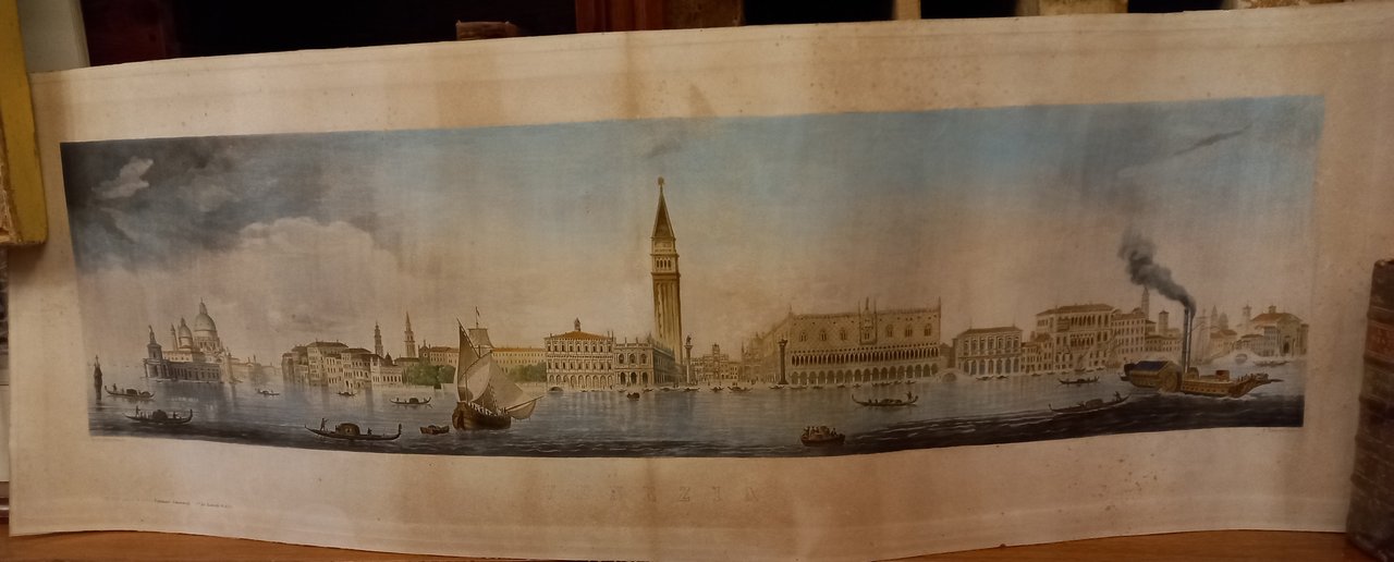 Litografia in acquarellataura coeva a tinte tenui di mm 985 x 301 nella parte litografata, mentre le dimensioni del foglio sono di mm 1000 x 365. Bel panorama del Bacino di San Marco, con presenti numerosissime imbarcazioni, tra cui spicca uno dei primi battelli a vapore attivi nella Laguna di Venezia. Gariboldi, che disegnò questo foglio per l'incisore Citterio, fu un buon pittore Milanese, celebrato soprattutto per i suoi notevoli paesaggi. Foglio non comune. (EN) Lithograph in contemporary watercolor in soft colors measuring 985 x 301 mm in the lithographed part, while the dimensions of the sheet are 1000 x 365 mm. Beautiful panorama of the San Marco Basin, with numerous boats present, among which one of the first steamboats stands out active in the Venice Lagoon. Gariboldi, who designed this sheet for the engraver Citterio, was a good Milanese painter, celebrated above all for his remarkable landscapes. Uncommon sheet.