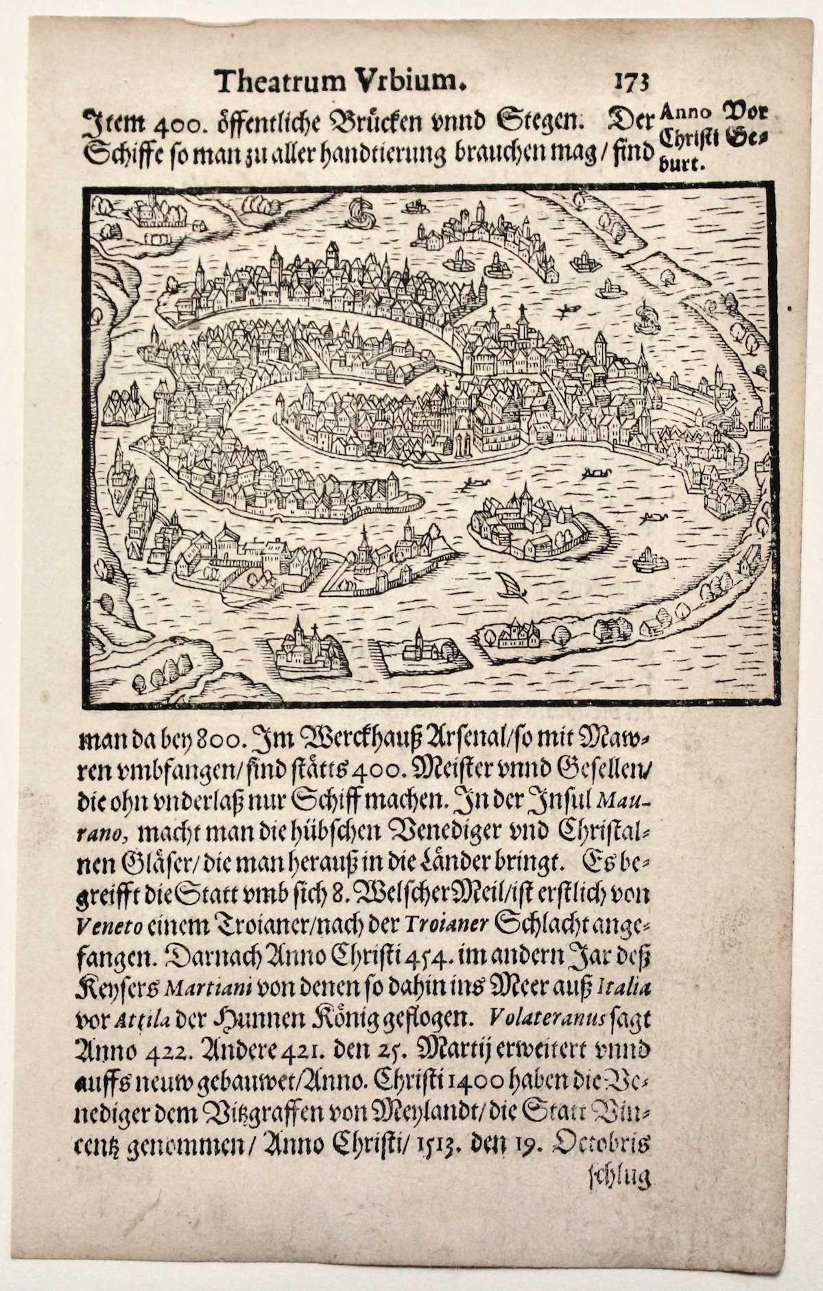 Incisione in legno, mm 70x95. Tratta da "Theatrum Urbium". Buon esemplare con leggere tracce di sporco superficiale. Moretto, 34; Cassini, 24.