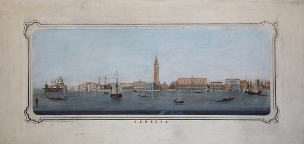 Veduta panoramica della città, firmata dall'incisore Giuseppe Giudici per la tipografia Ronchi di Milano. La tipografia, fondata da Luigi Ronchi, produceva stampe, carte e guide; come editore, Ronchi, nel 1848, fu attivo con pubblicazioni patriottiche e risorgimentali incluse memorie sulle 5 giornate. Nei repertori bibliografici compare, nella seconda metà dell’Ottocento, l’intestazione di “R. Stabilimento Litografico Luigi Ronchi e tipografia degl'ingegneri”. La veduta reca in basso l’imprint “Milano presso L. Ronchi Corso Francesco N. 601”. È, dunque, databile a prima del 1869, quanto la tipografia stampava con indirizzo “Milano Ronchi Editore Negozio Corso Vittorio Emanuele 99 - Stabilimento Via S. Pietro all'Orto 11”. ' Acquaforte e acquatinta, finemente colorata a mano, piccole abrasioni visibili ai margini, tracce di colla al verso, nel complesso in buono stato di conservazione. ' Molto rara. Panoramic view of the city, signed by the engraver Giuseppe Giudici for the Ronchi printing house in Milan. The printing house was founded by Luigi Ronchi; in bibliographic repertories the heading 'R. Stabilimento Litografico Luigi Ronchi e tipografia degl'ingegneri' appeared in the second half of the 19th century. Ronchi produced prints, maps and guides; as a publisher, in 1848, it was active with patriotic and Risorgimento publications, including memoirs on the 5 giornate. The view has the imprint "Milano presso L. Ronchi Corso Francesco N. 601" at the bottom. It is therefore datable to before 1869, when the printing house had the address "Milano Ronchi Editore Negozio Corso Vittorio Emanuele 99 - Stabilimento Via S. Pietro all'Orto 11". ' Etching and aquatint, finely coloured by hand, small abrasions visible at the margins, traces of glue on the verso overall in good condition. ' Very rare. Cfr.