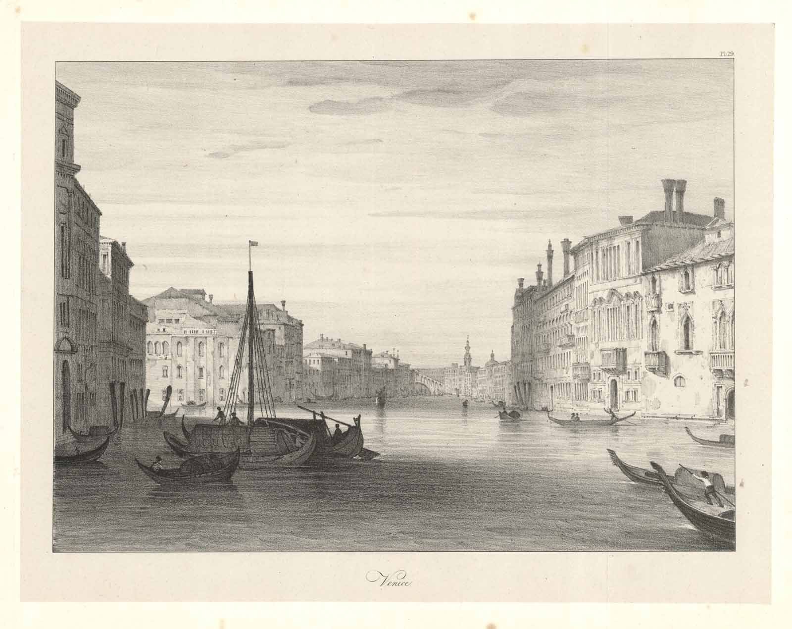 Litografia, stampata su carta della cina, tratta da un disegno di William Linton eseguito durante il suo tour in Italia negli anni 1828 e 1829. "In order to preserve perfectly the fidelity, spirit, and character of the originals, which were taken in pencil, they will be repeated in the same free and sketchy style by Drawings executed by himself, on Stone". L'opera, in cui si trova inserita la veduta, "Sketches in Italy: Being a selection." dedicata a Sua Maestà William IV è da considerarsi una delle più importanti del Grand Tour del XIX prodotta da un artista inglese; uscì in dodici fascicoli, ciascuno contenente 8 illustrazioni, pubblicati ogni due mesi.Ottimo stato di conservazione.Linton William (1791-1876) Il suo stile e la sua opera furono influenzati da Richard Wilson, il grande paesaggista gallese (1714-1782), per l'ampia composizione panoramica, nonché dall'opera di Claude Lorrain (1600-1682), di cui studiò gli effetti della luce naturale, e da Claude-Joseph Vernet (1714-1789), per la sua idealizzazione del classicismo. Nel 1817 si stabilì a Londra ed espose alla Royal Academy e alla British Institution. Nel 1823-24 ebbe parte attiva nella fondazione della Society of british Artists, della quale fu anche presidente nel 1837. Nel 1828-29 effettuò il lungo viaggio da cui scaturì la pubblicazione in due volumi in cui è inserita la presente veduta. Alcuni anni più tardi ne compì uno ancor più lungo nel Mediterraneo, visitò la Grecia, da cui scaturì l'opera "The scenery of Greece and its islands", edita nel 1850, la Sicilia, ancora il sud dell'Italia e il sud della Francia. Il risultato di questi viaggi fu un grande numero di schizzi e disegni che costituirono la base per i suoi dipinti di paesaggi di grandi dimensioni; per tale motivo fu definito "il nuovo Richard Wilson" e fu messo in comparazione con un altro grande artista del suo tempo: J.M.W. Turner. Il British Museum e la Tate Gallery conservano tra le sue opere anche quadri di vedute italiane.Rif: Vescarelli, p. 238; Benezit, Dictionnaire des Peintre…; Grant, A Dictionary of British Landscape Painters.