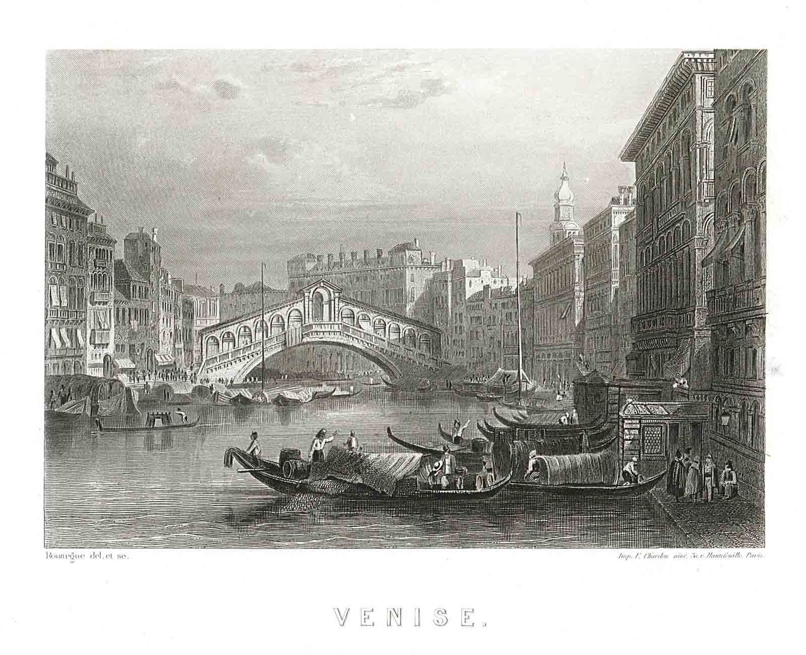 Veduta del Ponte di Rialto, sul Canal Grande, a Venezia. In primo piano diverse gondole