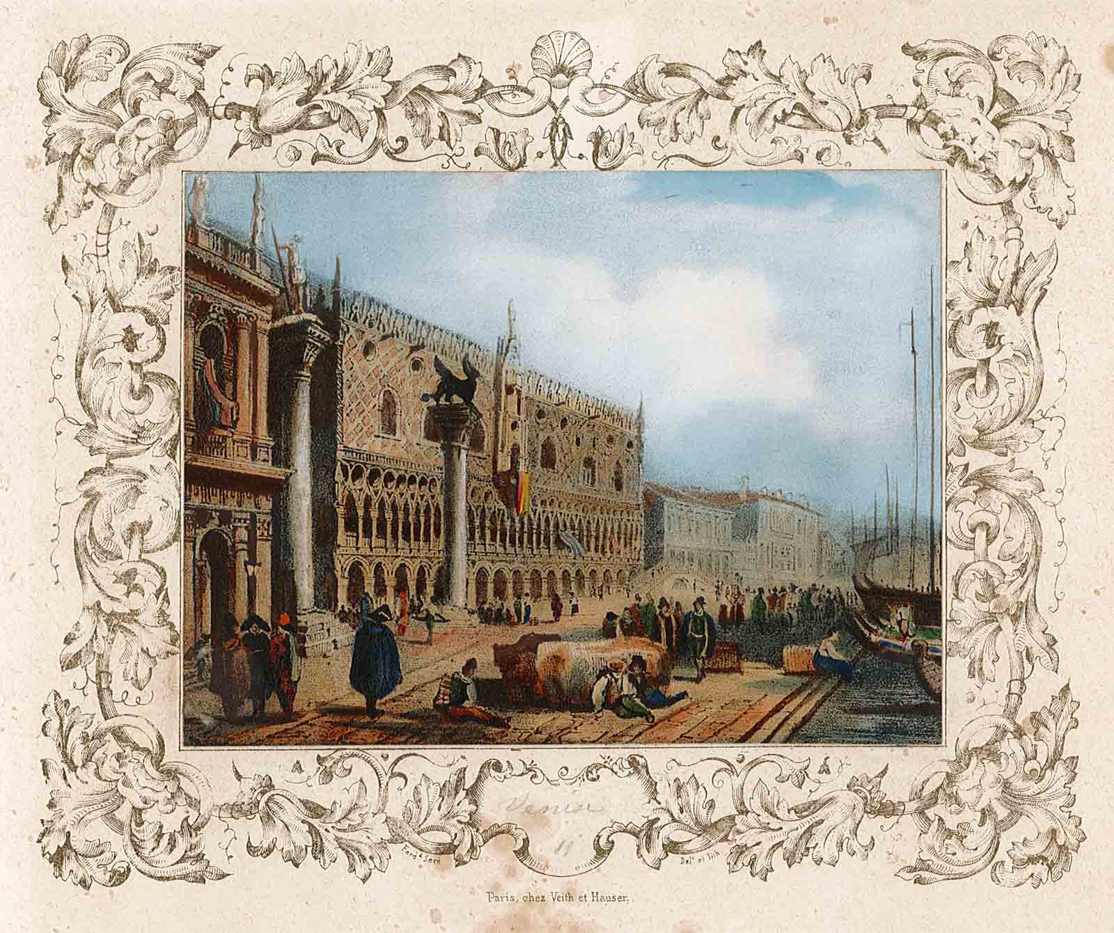 Graziosa e rara veduta di Venezia in vivace coloritura coeva. L'incisione è arricchita da decorativa cornice a motivi floreale a cura di Ferd. Seré.