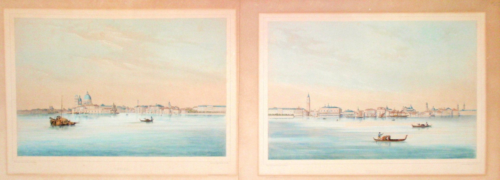 Due litografie, colorate, che, idealmente unite, compongono un lungo profilo panoramico della città colta dall'isola di San Giorgio, a partire dalla dogana e dalla chiesa della Salute. Ogni foglio misura mm. 445x615, mentre la parte illustrata è 320x480. Le stampe sono tratte dalla rarissima opera "De Venise à Constantinople à travers la Grèce et retour par Malte, Messine, Pizzo et Naples", una delle più rinomate, ricercate e costose opere di viaggio ottocentesche nel Mediterraneo.<BR>I fogli sono piacevolmente coloriti ed appena lievemente ingialliti nella parte illustrata, mentre i margini lo sono in maniera molto più marcata. Sono peraltro perfettamente conservati. <BR>Two litographs, coloured, each one mm 320x480 (sheet mm445x615). From "De Venise à Constantinople à travers la Grèce et retour par Malte, Messine, Pizzo et Naples". Margins strongly oxidated, litograph just very lightly.