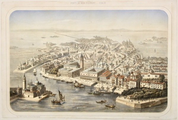 Litografia di Deroy, disegnata dallo stesso, mm 310x473, stampata a colori e rifinita a mano d'epoca. Bella veduta a volo d'uccello verso ovest con San Giorgio e piazza S. Marco in primo piano, San Zaccaria e San Giorgio dei Greci a destra ; dalla serie "Ports de Mer d'Europe". Buon esemplare con titolo rifilato in basso e margini di qualche centimetro; tre minime escoriazioni con assottigliamento della carta. Litograph by Deroy based on a drawing by himself, mm 310x473, printed in colour and originally finished by hand. From "Ports de Mer d'Europe". One among the most beautiful views of the XIX century. Good example with trimmed title at bottom, three very little scratches. <BR>