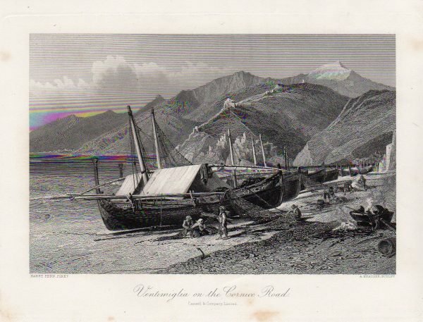 VENTIMIGLIA - on the Cornice Road. Harry Fenn pinx. A. Krausse sculp. - Acciaio con barche e pescatori in primo piano, nello sfondo la città e montagne.