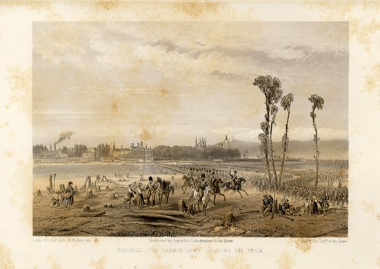 VERCELLI - "Vercelli, the French army crossing the Sesia", animata veduta con la città sullo sfondo.