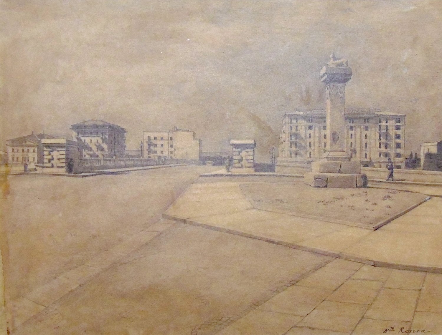 Coppia di disegni originali a lapis di grande formato, mm 385x520 e 485x665, incollati su cartone di supporto, firmati in basso a destra "Bto Ronca"; al verso sul cartone il primo riporta la seguente dicitura "Benvenuto Ronca studiò dal vero e disegnò" seguita dal titolo ed accanto "Disegno dal vero di Benvenuto Ronca" insieme ad un timbro ovale datato 1933-XI della ditta Ernesto Ferrari di Corso Porta Borsari; il secondo disegno invece riporta alcune annotazioni parziali ed una etichetta.<BR>I due disegni rappresentano una importante fase di sviluppo architettonico-edilizio di Verona: Il ponte della Vittoria era stato terminato da poco (i lavori erano iniziati nel 1926 e terminarono nel '29) e via Diaz era stata creata come collegamento dal Corso Cavour al nuovo ponte con conseguente abbattimento di molte case e della chiesa di S. Michele alla porta. I cavalli bronzei che oggi ornano i piloni furono realizzati in seguito ad un concorso del 1935. In Campagnola, dalla parte sinistra dell'Adige, si nota a sinistra del ponte sull'angolo col futuro piazzale Cadorna un edificio non finito, che fu inaugurato nel 1934 (Vecchiato, Verona nel Novecento, scheda 171). Lo stile essenziale e descrittivo delle opere è fortemente influenzato dal razionalismo e dalla severità architettonica imperante e ripropone anche, soprattutto il disegno verso il quartiere Trento, come era allora chiamato, una certa influenza metafisica. <BR>Benvenuto Ronca (Verona 1881- Vicenza 1944) frequentò l'Accademia Cignaroli ed esordì nel 1902. Partecipò poi a diverse esposizioni internazionali (Bruxelles 1910, Roma 1911) e successivamente ad una infinità di mostre nazionali e locali. Postume vennero organizzate tre mostre monografiche, nel '48, nel '58 a Palazzo Forti e nel '69. Sue opere sono esposte presso la Galleria d'arte moderna. Vedi: Brugnoli P. (A cura di), La pittura a Verona dal primo Ottocento a metà Novecento, BPV, 1986 pag. 333-335; Comanducci, I pittori italiani dell'Ottocento, pag. 609. <BR>