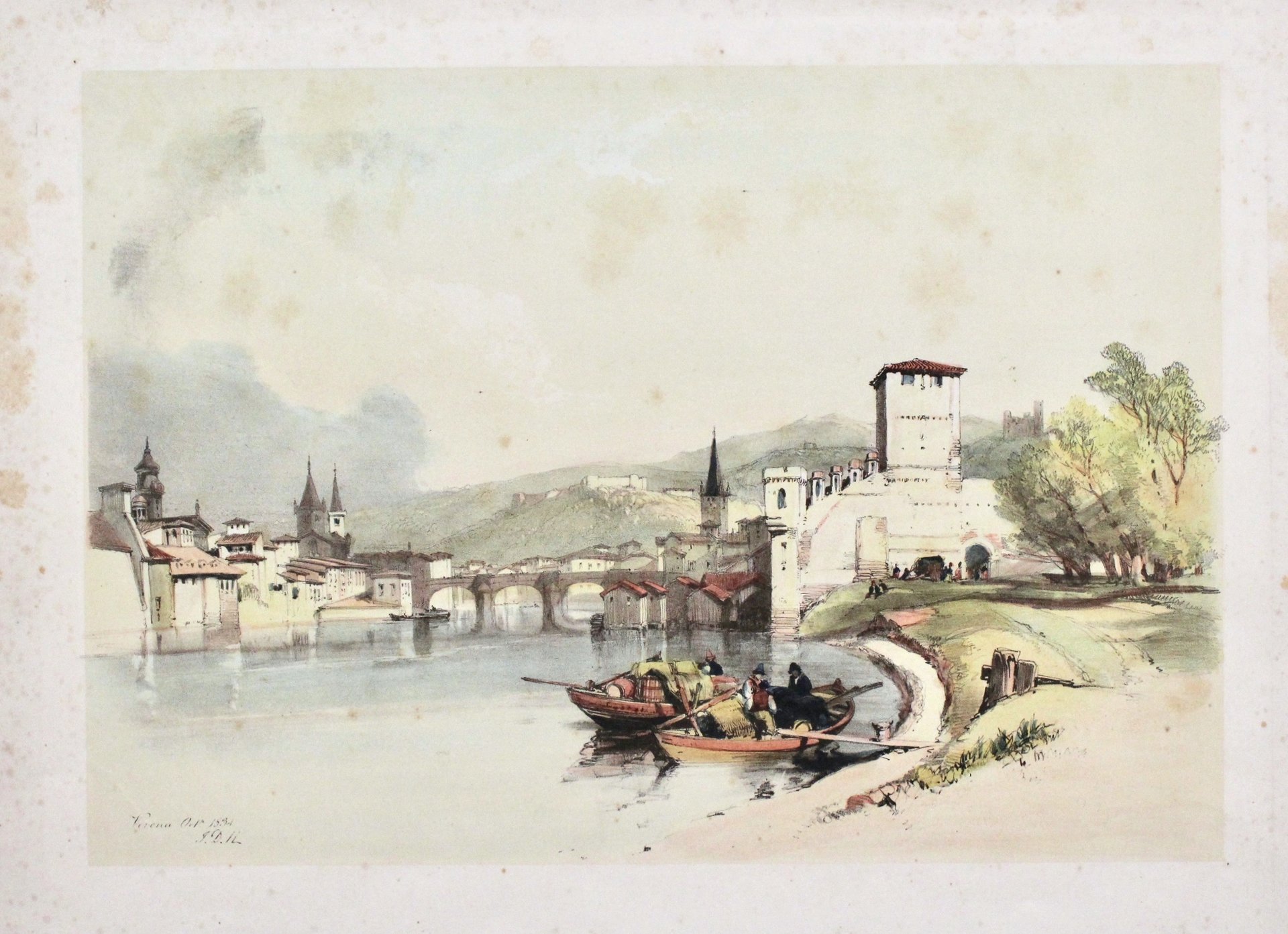 Litografia, dipinta a mano, titolata e firmata in basso a sinistra, mm 264x380. Bello scorcio con barche lungo l’Adige nei pressi di Porta Vittoria con panorama delle colline verso ponte Navi in primo piano. Bell’esemplare ben conservato, ampi margini. Leggere fioriture nell’immagine, più diffuse ai margini. Lithograph, hand-painted, titled and signed lower left, 264x380 mm. Beautiful view with boats along the Adige near Porta Vittoria with panorama of the hills towards Ponte Navi in the foreground. Nicely preserved specimen, wide margins. Slight blooming in the image, more diffuse in the margins.