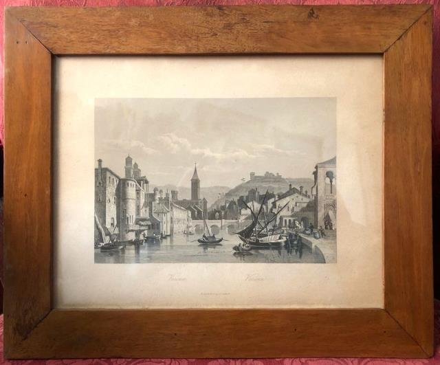 Parigi, 1858 circa. Incisione su acciaio, b/n, cm 20 x 26 (il foglio).Veduta di Verona con l'Adige, colta da Ponte delle Navi verso Ponte Nuovo e Santa Anastasia. Tratta da “L'Italie de nos jours” di E. Roche. Romantico scorcio animato della città con imbarcazioni e architetture tipiche. Un uniforme fisiologico ingiallimento ma in ottimo stato. Con vecchia cornice in legno e vecchio vetro. .