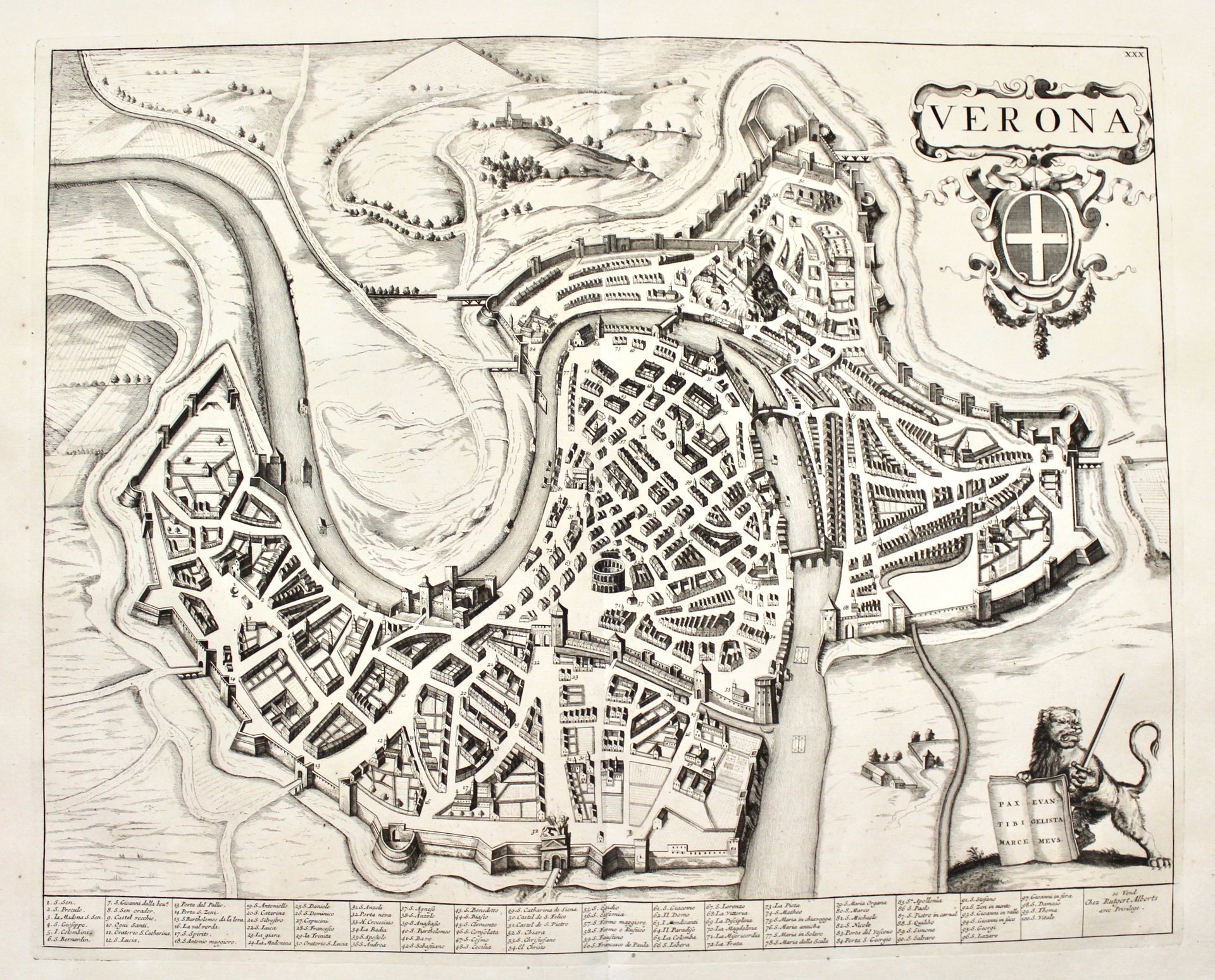 Incisione in rame, mm 425x535. Mortier, editore attivo ad Amsterdam ad inizio XVIII secolo, ristampò il "Theatrum Civitatum…Italiae" di Blaeu, pubblicato originariamente nel 1663 aggiungendovi un quarto volume, relativo a nord Italia e Toscana. Ottimo esemplare marginoso rappresentante la pianta della città in elevazione. <BR><BR>