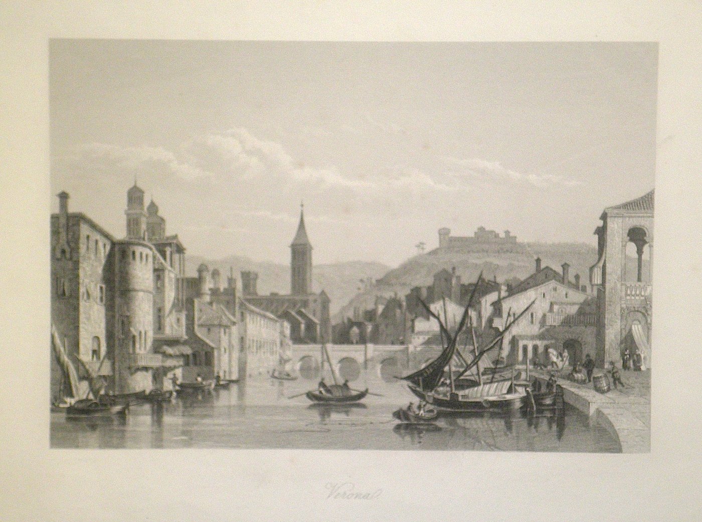 Incisione in acciaio, mm 129x190. Veduta di verona lungo l'Adige, colta da Ponte delle Navi verso Ponte Nuovo e Santa Anastasia. Tratta da "L'Italie de nos jours" di E. Roche. Ottimo esemplare marginoso. Carlo Perini-Cesare Sinistri "Verona nelle antiche stampe", 511 <BR><BR>