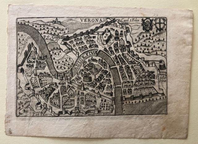 Francesco Bertelli, Padova, 1629. Pianta planimetrica della città tratta dal “Theatro delle Città d’Italia” di Pietro Bertelli, stampato dal figlio Francesco. Incisione in rame, b/n, cm 11,3 x 17,4 circa (alla lastra). Un po' di ingiallimento marginale ma conservazione molto buona.