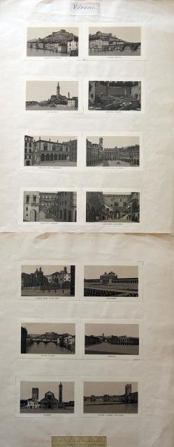 1930 circa. Serie di 14 foto riproduzioni derivate da incisioni in rame all'acquatinta, cm 8 x 12,5 ciascuna (il foglio). Le piccole vedute riportano scorci della città: Castel San Pietro, Ponte Pietra, Santa Anastasia, Teatro Antico, Palazzo del Consiglio, Piazza delle Erbe, Portoni Borsari, Mercato Vecchio, Tombe degli Scaligeri, Cimitero, Ponte Nuovo, Arena, San Zeno, Ponte Castel Vecchio. Applicate su carta sottostante con titolo manoscritto “Verone”. Alcune leggere gualciture della carta, ottima conservazione delle vedute.