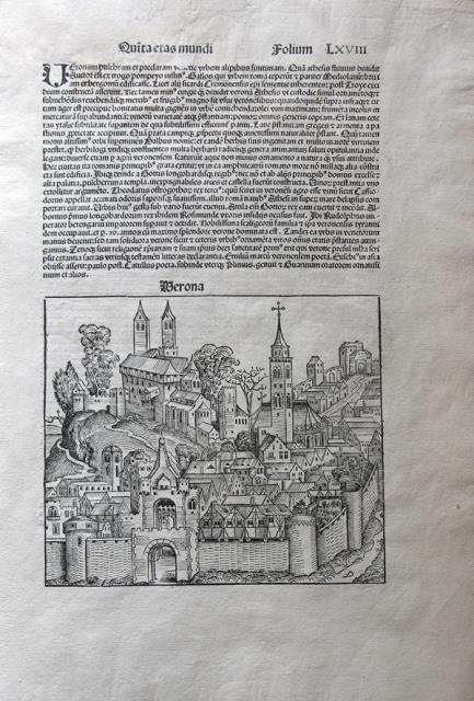 Anton Koberger, Norimberga, 1493. Dal “Liber Chronicarum Nurembergensi”, xilografia in b/n, cm 47,3 x 32,5 circa (il foglio); al verso del foglio simboli pontifici e teste di filososfi 8Anassimandro e Anassimene), testo in latino. La monumentale opera dello Schedel, il "Liber Cronicarum", rappresenta uno “dei più straordinari lavori mai realizzati” dall’editoria del XV secolo. Foglio molto ben restaurato al margine superiore, buon esemplare.