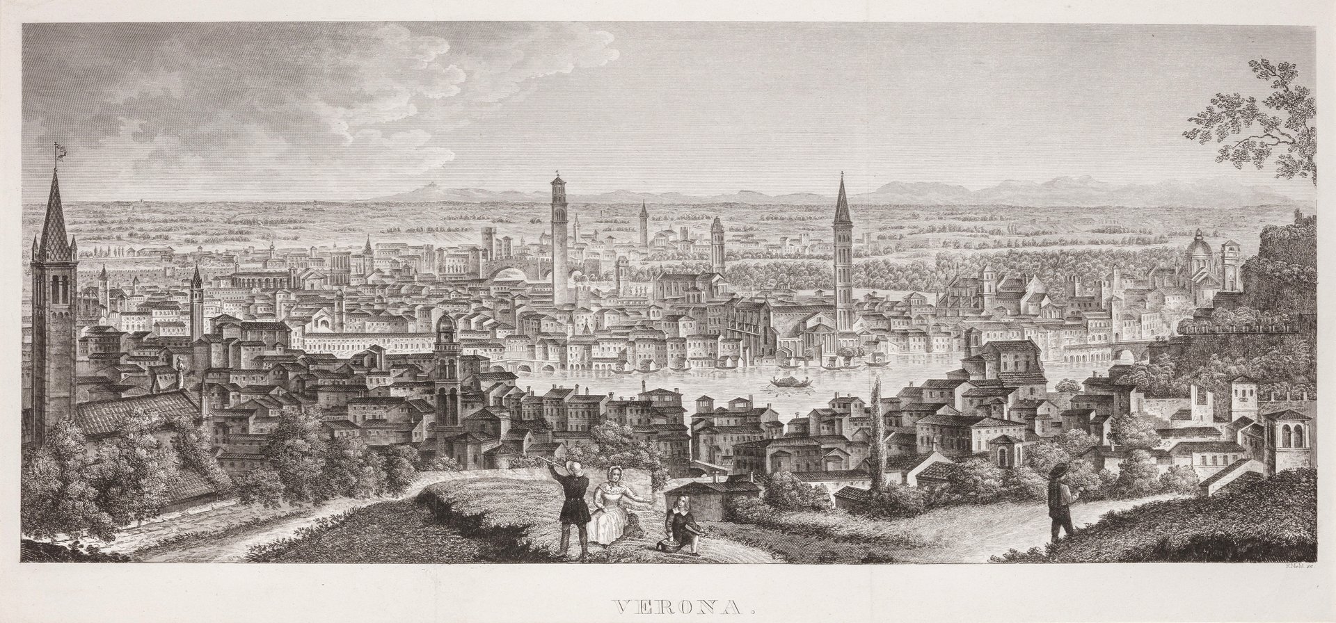 Incisione all'acquatinta mm 470x199, opera dell'incisore tedesco F. Mehl che si firma "F. Mehl sc". La stampa è databile intorno al 1840. <BR>Bellissima veduta panoramica della città presa dalla salita di San Zeno in monte. Al centro si nota l'indissolubile legame della città con il suo fiume, all'epoca navigabile; la veduta ci regala infatti una visione unica; la simbiosi delle rive del fiume con le architetture (oggi molte scomparse), i palazzi con i loro accessi all'acqua, le barchesse, i mulini galleggianti, la vita commerciale che scorreva sull'Adige. Rarissima e perfettettamente conservata. Sinistri - Perini n. 353, pag 202. <BR>