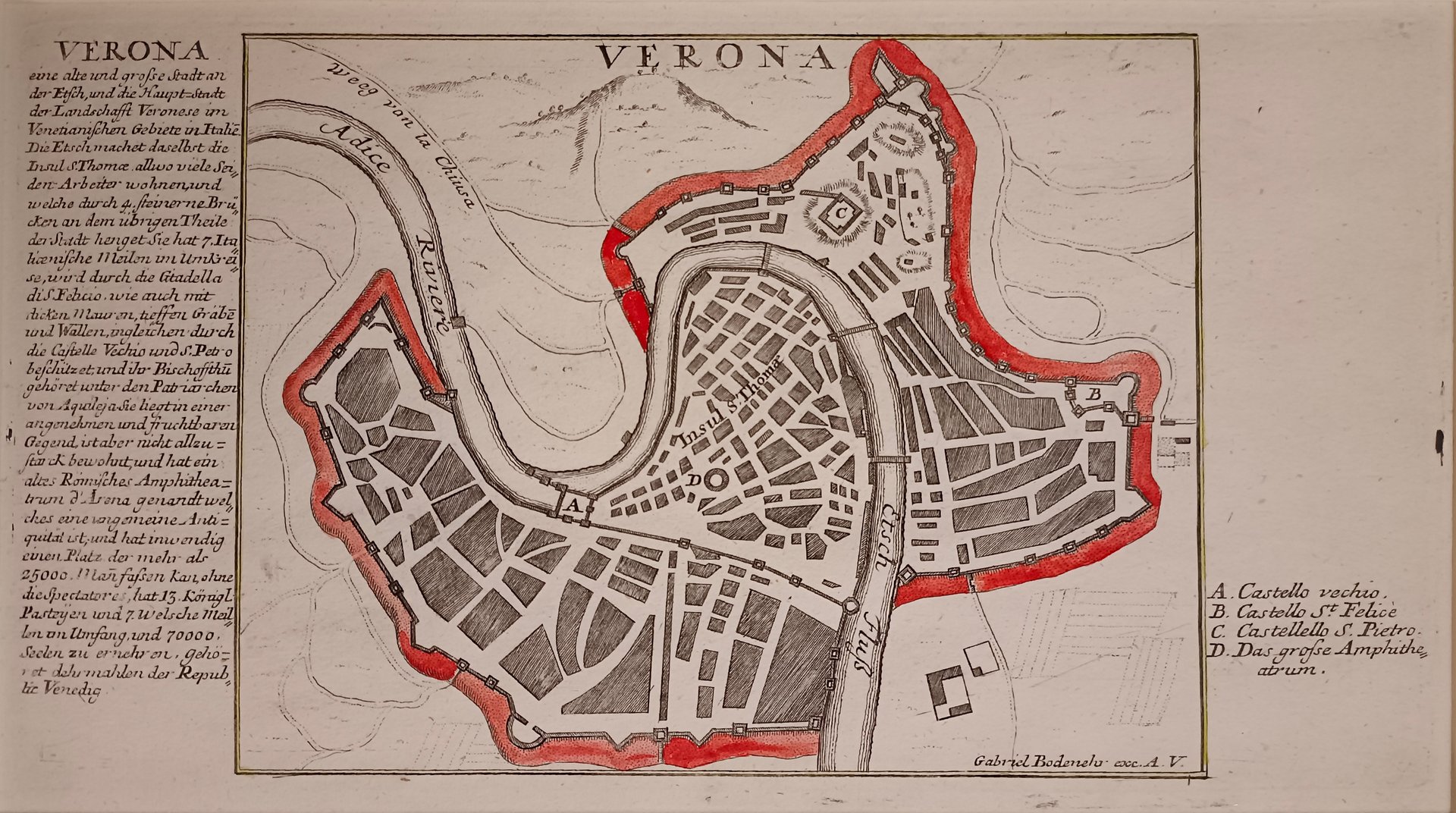La lastra era inserita nell'opera Curioses Staats und Kriegs Theatrum di Gabriel Bodenehr, pubblicata ad Augsburg nel 1725. Viene rappresentata la pianta della città di Verona, prospettica e fortificata con leggenda a destra di quattro punti di interesse: i Castelli e l'Anfiteatro. A sinistra oltre la linea di inquadramento il titolo e in tedesco descrizione della città. In basso a destra: Gabriel Bodenehr exud. A.V.