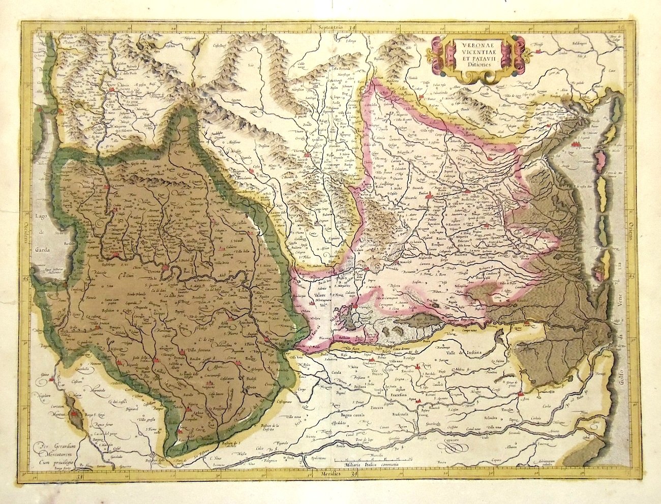 Incisione in rame, dipinta d'epoca, mm 370x494. La carta del Veneto di Mercator viene per la prima volta pubblicata a Duisburg nella seconda parte dell'atlante dello stesso cartografo, dal titolo "Italia, Sclavoniae et Graeciae tabula geographicae" nel 1589. Il nostro esemplare è tratto da "Atlas Sive Cosmographicae Meditationes de Fabrica Mundi", pubblicato dal 1606 al 1630 da Hondius, dopo l'acquisizione delle lastre dal figlio di Gerard. Bella carta con elegante cartiglio in stile rinascimentale. Buon esemplare. Koeman ME 35. <BR>Copper engraving, coloured, mm 370x494. First published in Duisburg in 1589 in part two of his atlas, "Italia, Sclavoniae et Graeciae tabula geographicae". Our example is from "Atlas Sive Cosmographicae Meditationes de Fabrica Mundi", published by Hondius between 1606 and 1630, after the acquisition of the plates from Mercator's heirs. Good condition. Koeman ME 35. <BR>