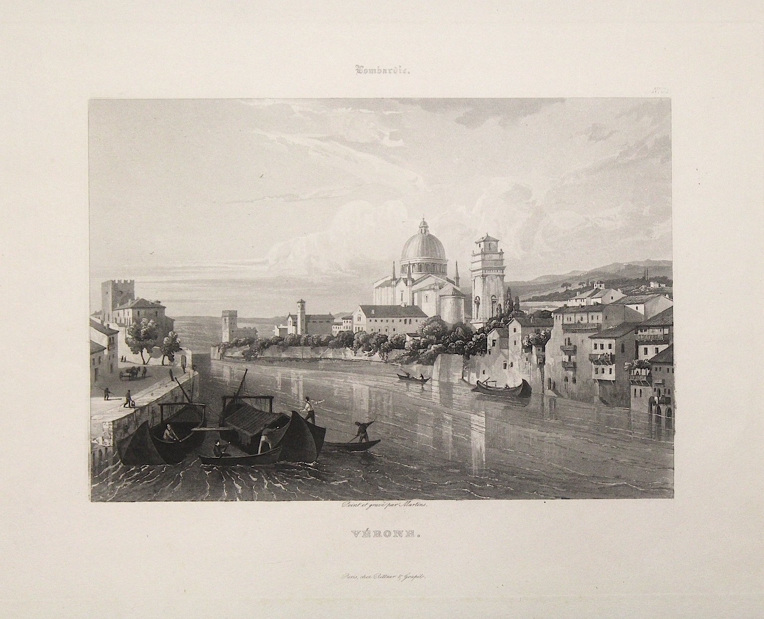 Acquatinta, mm 146x212, finemente eseguita da un dipinto dello stesso Martens. Veduta molto rara di San Giorgio, animata da bella scena di vita lungo l'Adige. Perfetta conservazione, ampi margini. Sconosciuta a Sinistri-Perini, Verona nelle antiche stampe.