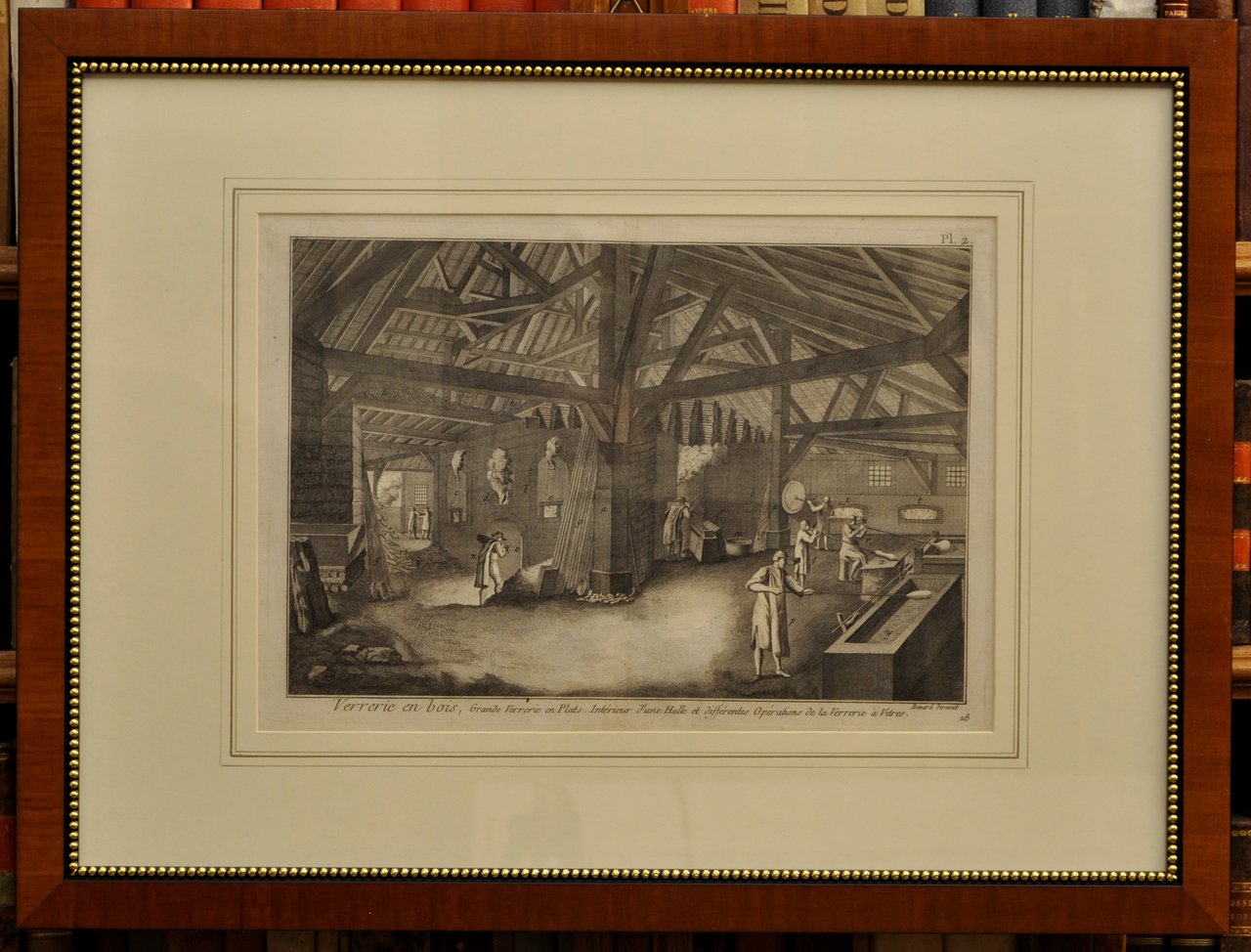 Incisione all'acquaforte di mm 355 x 250 su vergatina francese settecentesca. Foglio senza difetti a pieni margini. Sotto l'immagine a sinistra in piccolo "Benard direxit" mentre più in grande :"Verrerie en bois , Grande Verrerie en Plats. Interieur d'une Halle et differentes Operations de la Verrerie a Vitres". Tavola numero 28 e seconda Planche della Sezione della prima edizione della Encyclopedie relativa all'arte vetraria. Probabilmente la più bella incisione di tutto la sezione.