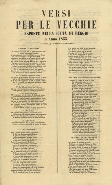 Venti versi in rima in quattro fogli “Il trionfo di Sandrone, Il prograsso, Dispensa del giudizio alle donne, Le sorelle di Festonte cangiate in pioppi, Il tempo fa passare amore - amore fa passare il tempo, La caccia, Volo d’Icaro, Scena comica in musica, Ritrovato per tingere il Vino, Il ridicolo consulto, Festino venale di ballo, i rinfreschi, La scoperta d’un tesoro, I mangiatori d’Insalata, Una sorpresa, La scritta matrimoniale, Il servo accordo a peso, Nuovo metodo d’asciugare i salami, il ratto, l’astrologo”. Reggio per Torreggiani e Comp.