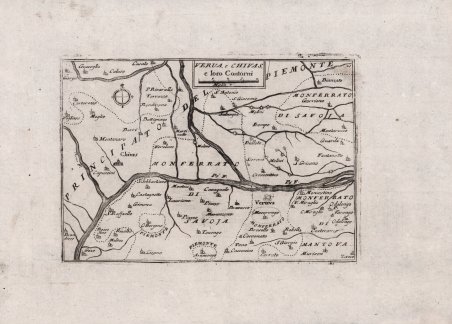 Carta tratta dal volume sulla Savoia del rarissimo ' Teatro della Guerra diviso in XXXXVIII parti ' di Vincenzo Coronelli, edito a Venezia (sebbene nel frontespizio sia indicato Napoli) tra il 1706 ed il 1709. La raccolta comprende centinaia di vedute, carte geografiche e nautiche di tutte le parti del mondo. Come scrive Ermanno Armao, grande studioso del Coronelli, “non è facile stabilire quanti e quali sono i volumi che compongono la raccolta". Secondo Augusto De Ferrari (cfr. Dizionario Biografico degli Italiani - Volume 29, 1983): “il ' Teatro della guerra ' era previsto in quarantotto volumi, ma ne uscirono solo ventisette a Venezia tra il 1706 e il 1709, anche se recano diverse indicazioni, ed intendeva essere una descrizione geografica degli Stati coinvolti nella guerra di successione spagnola, con poche pagine di testo e molte tavole (circa duemila), non tutte originali”. ' Alcune carte derivano da quelle già incluse nel testo dell'Isolario ' del 1696, con alcune varianti – spesso nella dedica. La maggior parte delle vedute viene tuttavia realizzata appositamente per l'opera. Acquaforte, in perfetto stato di conservazione. ' Carta molto rara. Carta tratta dal volume sulla Savoia del rarissimo ' Teatro della Guerra diviso in XXXXVIII parti ' di Vincenzo Coronelli, edito a Venezia (sebbene nel frontespizio sia indicato Napoli) tra il 1706 ed il 1709. La raccolta comprende centinaia di vedute, carte geografiche e nautiche di tutte le parti del mondo. Come scrive Ermanno Armao, grande studioso del Coronelli, “non è facile stabilire quanti e quali sono i volumi che compongono la raccolta". Secondo Augusto De Ferrari (cfr. Dizionario Biografico degli Italiani - Volume 29, 1983): “il ' Teatro della guerra ' era previsto in quarantotto volumi, ma ne uscirono solo ventisette a Venezia tra il 1706 e il 1709, anche se recano diverse indicazioni, ed intendeva essere una descrizione geografica degli Stati coinvolti nella guerra di successione spagnola, con poche pagine di testo e molte tavole (circa duemila), non tutte originali”. ' Alcune carte derivano da quelle già incluse nel testo dell'Isolario ' del 1696, con alcune varianti – spesso nella dedica. La maggior parte delle vedute viene tuttavia realizzata appositamente per l'opera. Acquaforte, in perfetto stato di conservazione. ' Carta molto rara. Cfr.