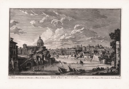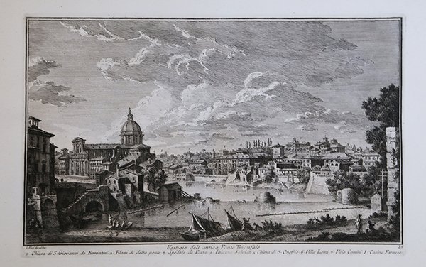 Ponte Trionfale, detto anche Vaticano o Neroniano, era situato nelle vicinanze di ponte Vittorio Emanuele II. Venne costruito probabilmente al tempo di Caligola, tra il 37 e il 41 d.C., per collegare il Campo Marzio con il suo Circo in Vaticano, detto Circo di Caligola e Nerone. Sul ponte passava la via Triumphalis, che partiva nell'area tra il Celio ed il Palatino ed arrivava fino a Veio. Non si conosce l'epoca della sua distruzione. I resti dell'antico ponte sono ancora visibili nei periodi di secca del fiume Tevere.La prospettiva è dalla zona di Castel Sant'Angelo. Degli edifici raffigurati nella tavola del Vasi sono oggi scomparsi l'Ospedale de' Pazzi e Villa Corsini (Palazzo Corsini con il suo grande giardino). Veduta tratta dalla monumentale opera ' Delle magnificenze di Roma antica e moderna.Pubblicata in 10 volumi dal 1747 al 1761, l’opera presenta 238 incisioni in rame, ciascuna incisione con testo narrativo che fornisce informazioni storiche e documentarie. ' Conosciuto dai più semplicemente come il "maestro" di Giovanni Battista Piranesi, Giuseppe Vasi rivela in quest'opera monumentale la pienezza della sua creatività grafica. I 10 libri che la compongono hanno ognuno un frontespizio con titolo e data diversi: ' Libro primo che contiene le porte e mura; Libro secondo, che contiene le piazze principali di Roma con obelischi, colonne, ed altri ornamenti; Libro terzo, che contiene le basiliche e chiese antiche di Roma; Libro quarto che contiene i palazzi e le vie più celebri; Libro quinto che contiene i ponti e gli edifizj sul Libro sesto che contiene la chiese parrocchiali; Libro settimo che contiene i conventi e case dei chierici regolari; Libro ottavo che contiene i monasteri e conservatorj di donne; Libro nono che contiene i collegj, spedali, e luoghi pii; decimo che contiene le ville e giardini più rimarchevoli. Le ' Magnificenze ' forniscono un panorama completo e al tempo stesso anticonvenzionale dell'Urbe: così, insieme alle consuete, celeberrime inquadrature desunte dalla migliore tradizione vedutistica, si trova anche una Roma insolita, quella che, talvolta, non esiste più. A quest'opera, di centrale importanza nell'editoria romana di metà Settecento, l'Autore aveva lavorato per quasi un ventennio realizzando una monumentale guida dell'Urbe dove accanto alle consuete e celeberrime inquadrature tratte dalla migliore tradizione vedutistica, immortala anche scorci insoliti che sono poi scomparsi con il cambiare della città. Il testo che accompagna le vedute nel primo volume è opera di Giuseppe Bianchini, nel secondo di Orazio Orlandi e nei restanti del Vasi stesso. A partire dall'edizione del 1786, l'opera del Vasi, fu aggiornata dal figlio Mariano, che la pubblicò col titolo ' Raccolta delle più belle vedute antiche, e moderne di Roma, mostrando solo il nome del padre come autore. Questa nuova edizione presentava molte tavole della prima edizione, ed alcune nuove. Anche la pubblicazione di Mariano Vasi fu stampata più volte, sempre con l’aggiunta di nuove tavole. Esemplare tratto dall'edizione del 1786. Acquaforte, stampata su carta vergata coeva, completa dei margini, in ottimo stato di conservazione. ' View taken from the monumental work ' Delle magnificenze di Roma antica e moderna. Published in 10 volumes from 1747 to 1761, the work features 238 copper engravings, each engraving with a narrative text that provides historical and documentary information. Known by most simply as the "master" of Giovanni Battista Piranesi, Giuseppe Vasi reveals in this monumental work the fullness of his graphic creativity. The 10 books that compose it each have a title page with a different title and date: ' Libro primo che contiene le porte e mura; Libro secondo, che contiene le piazze principali di Roma con obelischi, colonne, ed altri ornamenti; Libro terzo, che contiene le basiliche e chiese antiche di Roma; Libro quarto che contiene i palazzi e le vie più celebri; Libro quinto che contiene i ponti e gli edifizj sul Libro sesto che contiene la chiese parrocchiali; Libro settimo che contiene i conventi e case dei chierici regolari; Libro ottavo che contiene i monasteri e conservatorj di donne; Libro nono che contiene i collegj, spedali, e luoghi pii; decimo che contiene le ville e giardini più rimarchevoli. The ' Magnificences ' provide a complete and at the same time unconventional panorama of the City: thus, together with the usual, celebrated shots taken from the best tradition of ' vedutistica, one also finds an unusual Rome, one that, at times, no longer exists. The author had worked on this work, of central importance in Roman publishing in the middle of the eighteenth century, for almost twenty years, producing a monumental guide to the “Urbe” where, alongside the usual and famous shots taken from the best tradition of ' vedutistica, he also immortalized unusual views that have since disappeared with the change of the city. The text that accompanies the views in the first volume is by Giuseppe Bianchini, in the second by Orazio Orlandi and in the remaining ones by Vasi himself. Starting from the edition of 1786, the work of Vasi, was updated by his son Mariano, who published it under the title ' Raccolta delle più belle vedute antiche, e moderne di Roma, showing only the name of his father as author. This new edition presented many plates of the first edition, and some new ones. The publication of Mariano Vasi was also printed several times, always with the addition of new plates. ' View taken from 1786 edition of the Vasi’s ' Delle Magnificenze di Roma Antica e Moderna. Etching, printed on contemporary laid paper, in very good condition. Cfr. Scalabroni, 171