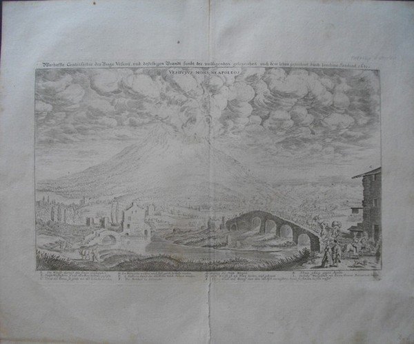 Dalla “Topographia Italiae”, Francoforte, 1640. Incisione in rame all’acquaforte, b/n, cm 21 x 33,2 (alla lastra). In alto a sinistra, nel margine bianco, fuori dalla parte incisa ma in lastra, il nome dell’incisore, Ioachino Sandrart (Sandrart, Joachim - 1606-1688) e l’indicazione della data, 1631; in basso, legenda contenente l’indicazione dei luoghi principali alle falde del Vesuvio. Impressione stanca ma in ampi margini ampi margini.