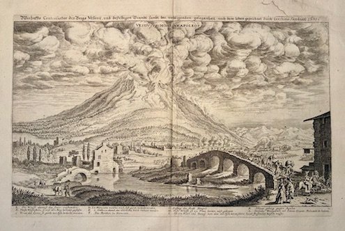 Incisione originale su rame (cm. 33x21 più ampi margini bianchi) tratta da ‘Itinerarium Italiae Nov-antiquae’ di Martin Zeiller. Antico restauro al margine superiore bianco che tocca leggermente la parte incisa, altrimenti esemplare in ottimo stato di conservazione.