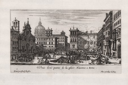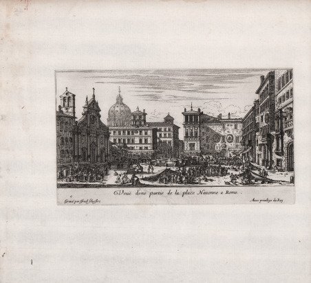 Veduta tratta dalla serie ' Vues d’Italie. “Suite de 12 pièces numérotées au bas, à gauche. Il y a une grande ressemblance entre cette suite et la suite du numéro précédent ; on les a quelquefois mêlées, et on les trouve dans le commerce, complétées l'une par l'autre.” (cfr. Faucheux, Catalogue raisonné de toutes les estampes qui forment l'oeuvre d'Israel Silvestre). Il Silvestre, incisore e disegnatore, nasce a Nancy nel 1621. Come era consuetudine all'epoca, fece diversi viaggi in Italia per copiare i vecchi maestri e per migliorare le sue abilità con i più grandi maestri. Faucheux fissa le date di questi viaggi, il primo prima del 1640 (Israel non aveva ancora 20 anni), il secondo dal 1643 al 1644 e l'ultimo intorno al 1653. Israel portò con sé molte vedute dell'Italia, quasi tutte incise. Fino al 1659, fece altri viaggi in Francia e in Lorena, da cui trasse molti disegni e incisioni. Il suo stile fu, all'inizio, piuttosto sciolto, ma dal 1643 in poi divenne più raffinato e delicato, acquisendo accuratezza e precisione senza essere asciutto, risultando a volte simile a quello di Jacques Callot o di Stefano della Bella, con i quali ebbe rapporti di amicizia attraverso il suo zio materno e mentore, l’editore Israël Henriet. Accanto alle testimonianze per la Roma antica mostrò ben presto un grandissimo interesse per la città "moderna", divenendo uno dei precursori del vedutismo - non solo nel campo incisorio - anticipando artisti come Lievin Cruyl e Gaspar van Wittel. È praticamente impossibile fare un inventario completo delle opere di Israël Silvestre, tanto era prolifico l'artista. Ha lasciato numerosi disegni e più di mille incisioni. Tra le sue opere più belle, possiamo tuttavia menzionare le numerose e complesse “piccole” suite (composte da poche tavole) sulle piazze, le chiese e le antichità di Roma. Acquaforte, in ottimo stato di conservazione. Bibliografia L. E. Faucheux, Catalogue raisonné de toutes les estampes qui forment l'oeuvre d'Israel Silvestre: précédé d'une notice sur sa vie (1857), n. 5.6; F. Baré, Israël Silvestre et sa famille, suivi du catalogue de son oeuvre (1885), n. 843. View taken from the series ' Vues d’Italie. “Suite de 12 pièces numérotées au bas, à gauche. Il y a une grande ressemblance entre cette suite et la suite du numéro précédent ; on les a quelquefois mêlées, et on les trouve dans le commerce, complétées l'une par l'autre.” (cfr. Faucheux, Catalogue raisonné de toutes les estampes qui forment l'oeuvre d'Israel Silvestre). Silvestre, engraver and draftsman, was born in Nancy in 1621. As was customary at the time, he made several trips to Italy to copy the old masters and to improve his skills with the greatest masters. Faucheux fixes the dates of these trips, the first before 1640 (Israel was not yet 20 years old), the second from 1643 to 1644 and the last around 1653. Israel brought with him many views of Italy, almost all of them engraved. Until 1659, he made other trips to France and Lorraine, from which he took many drawings and engravings. His style was, at the beginning, rather loose, but from 1643 onwards became more refined and delicate, acquiring accuracy and precision without being dry, resulting sometimes similar to that of Jacques Callot or Stefano della Bella, with whom he had friendly relations through his maternal uncle and mentor, the publisher Israël Henriet. Alongside the testimonies to ancient Rome, he soon showed great interest in the "modern" city, becoming one of the precursors of vedutism - not only in the field of engraving - anticipating artists such as Lievin Cruyl and Gaspar van Wittel. It is quite impossible here to make a complete inventory of Israël Silvestre's works, so prolific was the artist. He left numerous drawings and more than a thousand engravings. However, among his most beautiful works, we can mention the many complex "small" suites (composed of a few plates) on the squares, churches and antiquities of Rome. Etching, in excellent condition. Bibliografia L. E. Faucheux, Catalogue raisonné de toutes les estampes qui forment l'oeuvre d'Israel Silvestre: précédé d'une notice sur sa vie (1857), n. 5.6; F. Baré, Israël Silvestre et sa famille, suivi du catalogue de son oeuvre (1885), n. 843. Cfr.