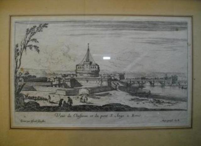 Incisione in rame all’acquaforte, b/n, cm 12 x 20 (alla lastra), in basso a sn. “Gravé par Israel Silvestre” (e il numero 2 poco sopra all’inizio della dicitura), in basso a destra “Avec privil. du R.”; foglio in primo stato, con bella filigrana di gallo (o rapace) con ali spiegate. Silvestre Israel (Nancy, 3 agosto, 1621 – Parigi, 11 ottobre 1691), appartenente a una famiglia di artisti francesi, fu disegnatore e incisore. Dopo la morte dei genitori, nel 1631, fu mandato a Parigi con lo zio Israel Henriet, grazie al quale imparerà a disegnare e a incidere; e grazie allo zio conoscerà Callot e Della Bella. Tra il 1638 e il 1641 (si pensa nel 1640), Silvestre compirà un primo viaggio in Italia; un secondo viaggio sarà quello del 1643, un terzo nel 1653. Dopo la seconda visita in Italia vengono pubblicate le “Vues d’Italie (1643 circa). Fu artista fin troppo prolifico, numerosissime sono le sue opere, tant’è che è quasi impossibile redigerne un inventario completo, avendo egli realizzato circa mille pezzi. Tra queste citiamo: “Vues de Paris et des environs” (1645), “Ports de mer” (1648), “Paysages” (1654), un secondo set di “Vues d’Italie”, il “Balletto Reale Noces de Tétis” (1655), Vues de châteaux (1658) dedicate a Luigi XIV. Dal 1662; incise lastre per il re: “Course de têtes et de bagues” (1662), “Plaisirs de l’isle enchantée” (1664) e “Châteaux royaux”. Il suo stile fu, all’inizio, piuttosto sciolto, ma a partire dalla pubblicazione delle prime “Vues d’Italie” divenne più raffinato e delicato, acquisendo accuratezza e precisione senza essere asciutto; a volte era simile a quello di Jacques Callot o di Stefano della Bella, con i quali ebbe rapporti di amicizia e dei quali ottenne l’esclusiva per la pubblicazione delle lastre. Infatti, mettendo bene a frutto i risultati del lavoro di Henriet, alla sua morte, avvenuta nel 1661, riuscì a ereditarne le lastre e a ottenere il privilegio di stampa e la vendita delle opere di Callot e di Della Bella, escludendo altri stampatori da questa posizione (ottenne le lastre del Callot alla morte dello zio Henriette; di Della Bella nel 1684). La veduta fa parte della raccolta delle “Vues d’Italie”, in questo caso di quelle relative a Roma e dintorni. Nel rispetto del classico stile dell’autore, essa fonde elementi reali a fantasie pittoriche. Bella e rara prova particolarmente nitida.