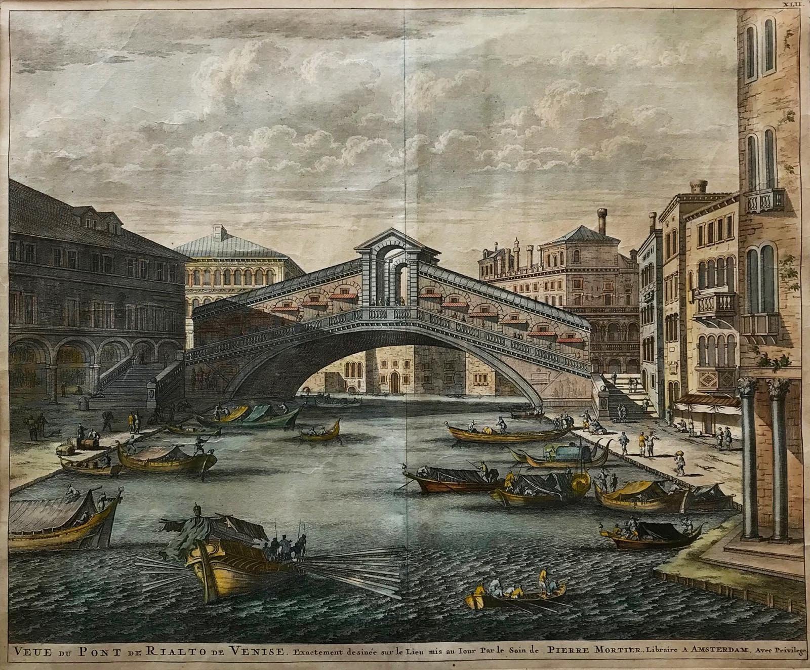 Veduta del famoso ponte di Rialto sul Canal Grande di Venezia. Scena animata dalla presenza di numerose imbarcazioni. L'incisione è caratterizzata da una gradevole acquerellatura a mano. Piega centrale editoriale.
