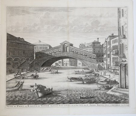 Bellissima veduta del ponte di Rialto a Venezia, visto dal fiume. Esemplare tratto dal primo volume del Nouveau Theatre de l'Italie, pubblicato ad Amsterdam nel 1704/5 e nel 1724, quale integrazione al progetto di Johannes Blaeu, iniziato nel 1663, del grande libro delle città, manchevole delle piante di gran parte della parte settentrionale della penisola. Il Blaeu, durante la sua lunga attività editoriale pubblica tre volumi sulle città italiane: nel 1663 i primi tre, suddivisi in Stato della Chiesa, Roma e Regno di Napoli e Sicilia. Alla sua morte, i suoi eredi danno alla luce altri due volumi, datati 1682, incentrati sulle città del Piemonte e della Savoia, poi ristampati da altri editori nel 1693 e 1697. Il francese Pierre Mortier pubblica una ristampa nel 1704/5, intitolata Nouveau Theatre de l’Italie. L’opera è in quattro volumi e comprende le lastre del Blaeu, ritoccate e modificate in piccola parte, integrate dall’aggiunta di numerose nuove mappe di proprio disegno, raffiguranti le città della parte settentrionale della penisola, racchiuse nel primo volume dell’opera. L’atlante del Mortier venne pubblicato con testo latino, francese ed olandese. La particolarità che differenzia le due edizioni di Blaeu e Mortier è rappresentata dal fatto che il testo non è al verso della singola mappa (che quindi è bianca nel retro), ma si trova all’inizio di ogni singolo volume. Il grande successo dell’opera diede origine ad un’ulteriore ristampa, praticamente identica, curata da R. Albertsm, edita nel 1724/5. ' Incisione in rame, in buono stato di conservazione. Spectacular view of Rialto bridge in Venice, as seen from up river. Plate taken from the first volume of the Nouveau Theatre de l'Italie, published in Amsterdam in 1704/5 and 1724, as an addition to the project of Johannes Baleu, begun in 1663, the greatlibro delle città, lacking the plans of much of the northern part of the peninsula. Blaeu, during his long editorial activity published three volumes on Italian cities: in 1663 the first three, divided into the State of the Church, Rome and the Kingdom of Naples and Sicily. At his death, his heirs gave birth to two more volumes, dated 1682, focused on the cities of Piedmont and Savoy, then reprinted by other publishers in 1693 and 1697. The French Pierre Mortier publishes a reprint in 1704/5, entitled Nouveau Theatre de l'Italie. The work is in four volumes and includes the plates of Blaeu, retouched and modified in small part, supplemented by the addition of several new maps of his own design, depicting the cities of the northern part of the peninsula, enclosed in the first volume of the work. Mortier's atlas was published with Latin, French and Dutch texts. The peculiarity that differentiates the two editions of Blaeu and Mortier is represented by the fact that the text is not on the back of the single map (which is therefore white in the back), but is at the beginning of each volume. The great success of the work gave rise to a further reprint, virtually identical, edited by R. Albertsm, published in 1724/5. ' Copper engraving, in good condition. Cfr. Cremonini pp. 83-90.