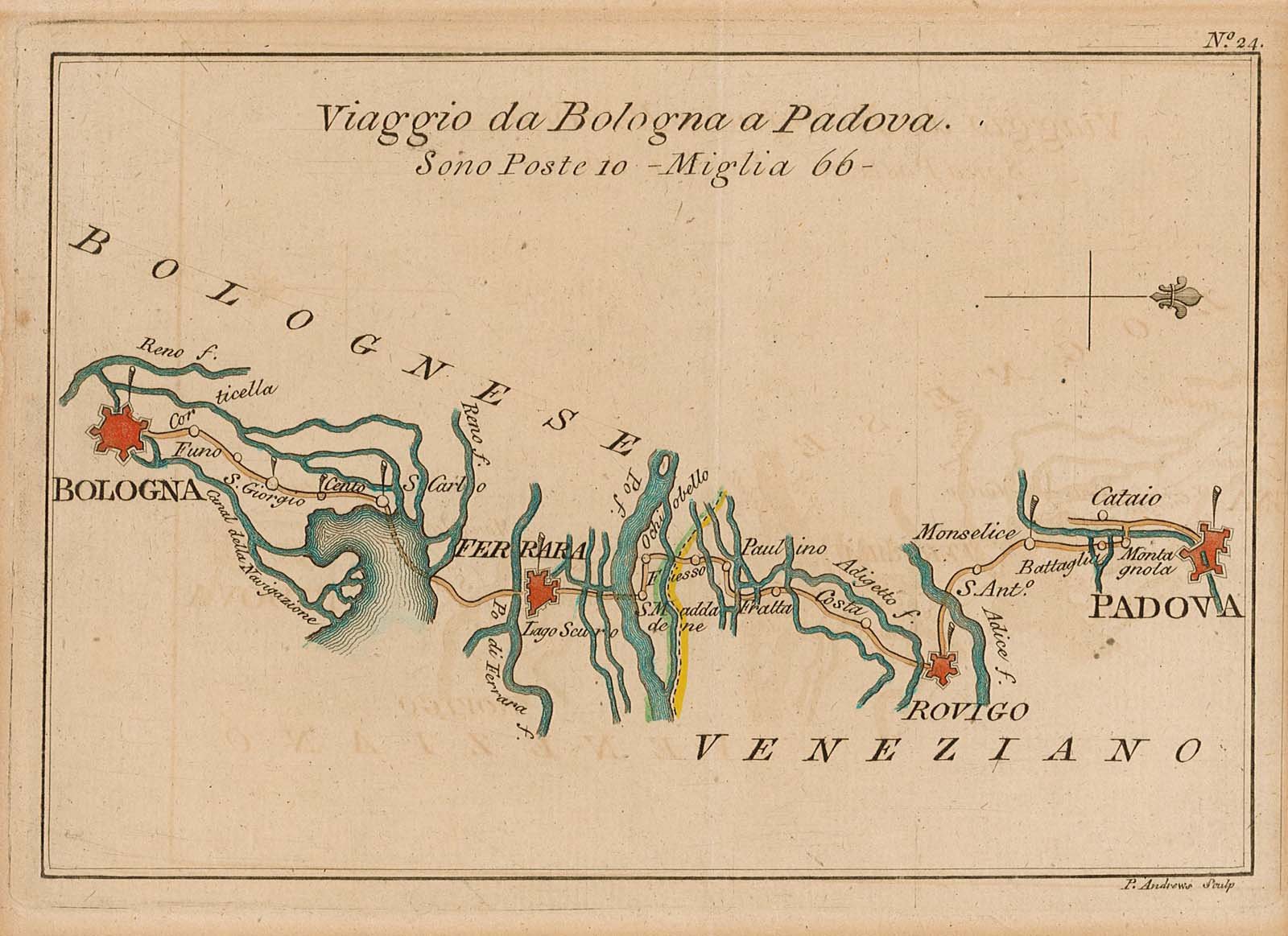 Viaggio da Bologna a Padova. Sono Poste 10 1/2 - Miglia 66